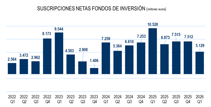 Asimismo, los Fondos de Renta Fija experimentaron un descenso de 1.914 millones de euros explicado por una rentabilidad negativa sumado a los ligeros reembolsos registrados. A pesar de ello, esta categoría acumula un incremento de 2.285 millones de euros en 2026.