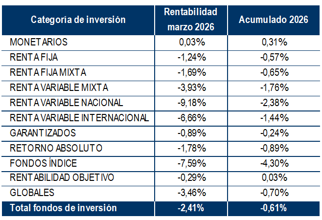 A falta de incorporar las valoraciones de los últimos días del mes, todas las categorías, con la excepción de los Fondos Monetarios, obtuvieron rendimientos negativos en marzo. Los mayores ajustes se registraron en los Fondos de Renta Variable Nacional (-9,2%), seguidos por los Fondos Índice (-7,6%) y los Fondos de Renta Variable Internacional (-6,7%).
