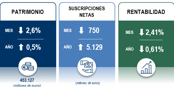 En el mes, el patrimonio de Fondos de Inversión disminuyó en 11.983 millones de euros, lo que supone un descenso del 2,6% respecto al mes anterior, situándose en 453.127 millones de euros. A pesar de ello, en lo que va de año, el patrimonio acumula un incremento de 2.271 millones de euros, equivalente al 0,5%.