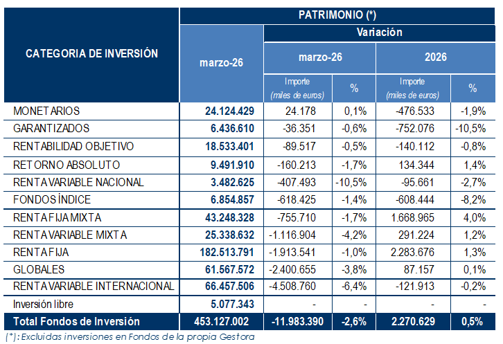 En el mes, los Fondos de Inversión registraron reembolsos netos por valor de 751 millones de euros, en un mes condicionado por la elevada incertidumbre en torno a la escalada del conflicto bélico en Oriente Medio.