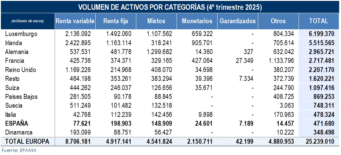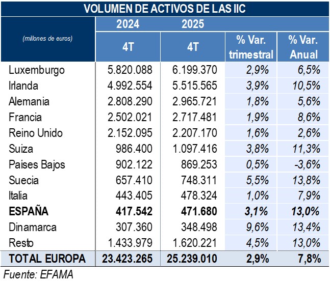 Según datos de EFAMA, el volumen de activos de las Instituciones de Inversión Colectiva europeas se situó en 25,24 billones de euros en diciembre de 2025.