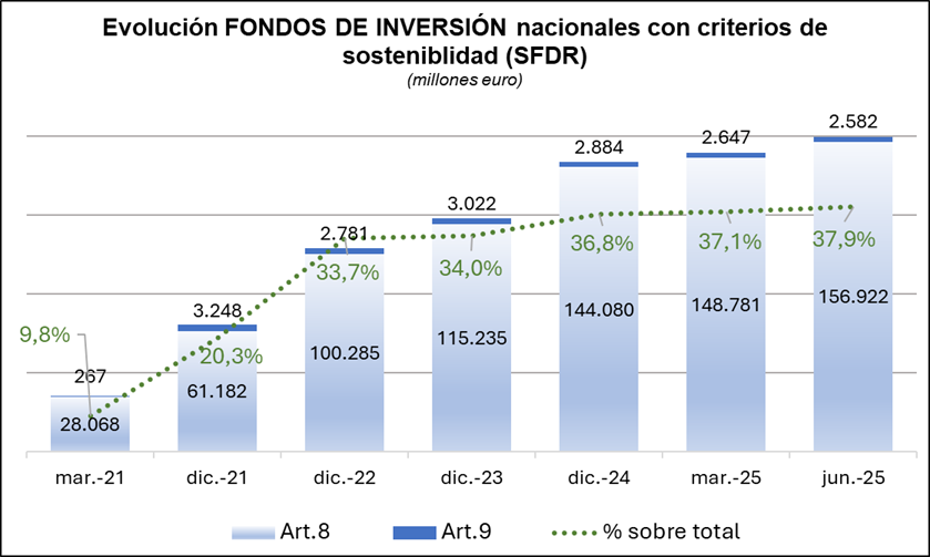 A junio de 2025, el patrimonio de Fondos de Inversión registrados como artículo 8 o 9 (SFDR) alcanzó los 159.504 millones de euros, lo que representaba el 37,9% del total.