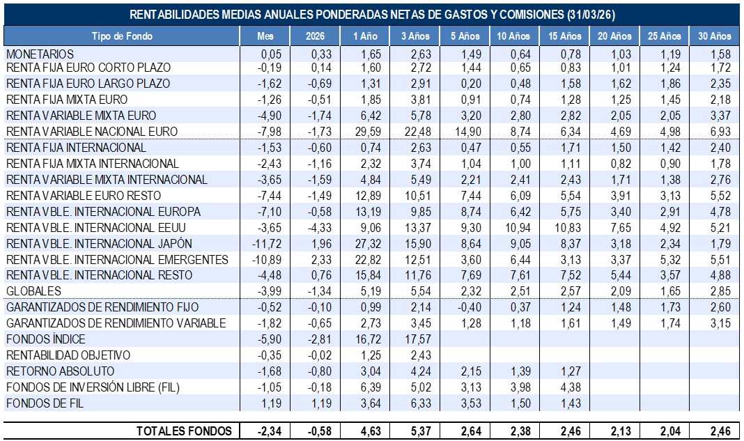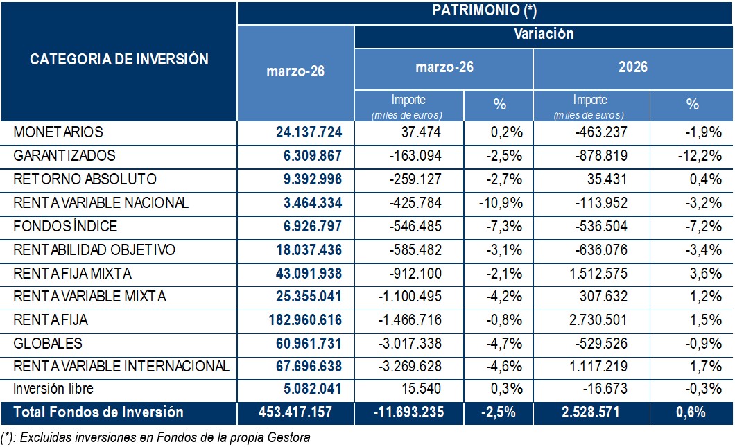 Los Fondos de Inversión registraron en marzo un ajuste en el volumen de activos como consecuencia del comportamiento negativo de los mercados financieros, junto con los reembolsos habidos en el mes en un entorno de elevada incertidumbre geopolítica.