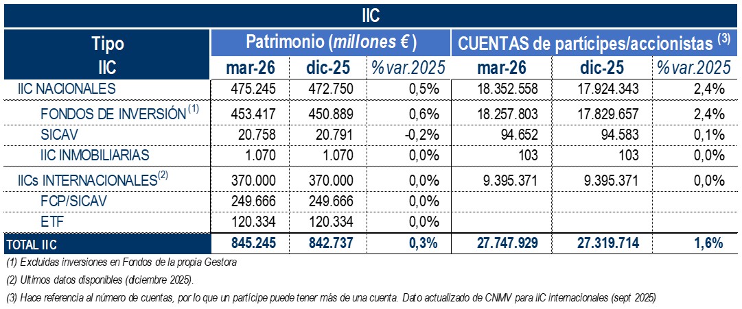 El PATRIMONIO en conjunto de la inversión colectiva (Fondos y Sociedades) experimenta un incremento en el año de 2.496 millones de euros, situándose en 845.245 millones de euros (0,3% más que en diciembre de 2025).