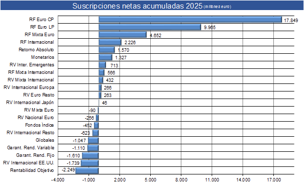 Las categorías más conservadoras, lideran en el año los nuevos flujos de entrada, donde los Fondos de Renta Fija y Fondos Monetarios acumulan 31.367 millones de euros de manera agregada. Adicionalmente, los Fondos de Renta Fija Mixta Euro superan los 4.650 millones de euros de suscripciones netas positivas. En el lado contrario, los Fondos Rentabilidad Objetivo, Renta Variable Internacional EEUU, Garantizados y Globales lideran los reembolsos netos (7.756 millones de euros en su conjunto).