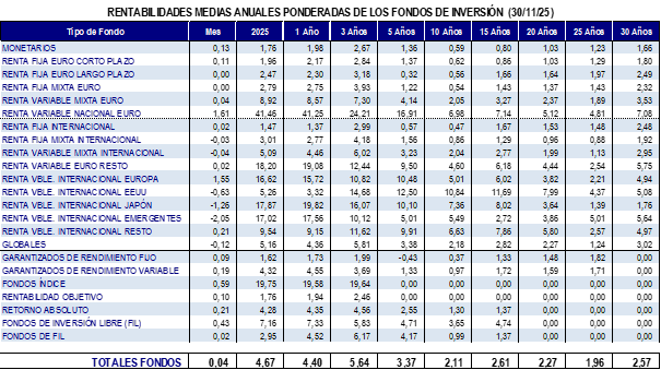 En este contexto, los Fondos de Inversión experimentaron en el mes una rentabilidad media ligeramente positiva. En noviembre, las vocaciones con mayor peso de acciones de renta variable nacional y europea, obtuvieron rentabilidades positivas superiores al 1,5%. Hasta noviembre, los Fondos de Renta Variable Nacional acumulan en el año una rentabilidad positiva del 41,5%. En el año, la rentabilidad anual media de los Fondos de Inversión alcanza el 4,7%.
