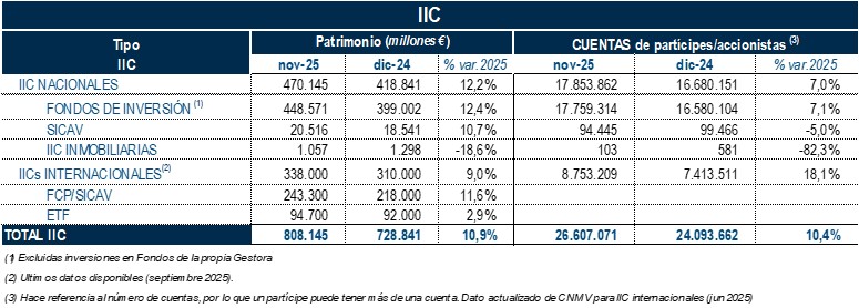 El patrimonio en conjunto de la inversión colectiva (Fondos y Sociedades) experimentó un incremento hasta octubre de 79.304 millones de euros, situándose en 808.145 millones de euros (10,9% más que en diciembre de 2024).