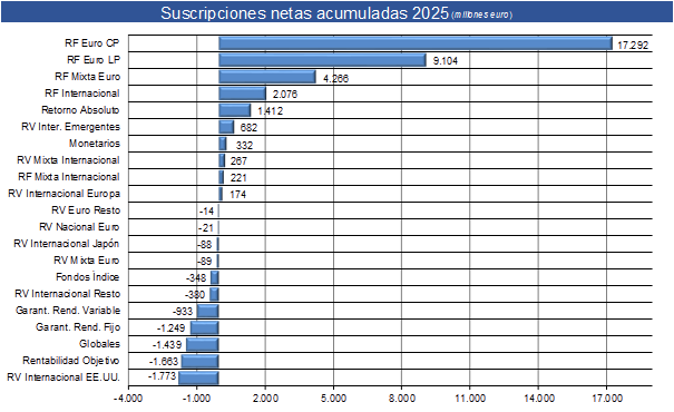 Las categorías más conservadoras, lideran en el año los nuevos flujos de entrada, donde los Fondos de Renta Fija y Fondos Monetarios acumulan 28.804 millones de euros de manera agregada. Adicionalmente, los Fondos de Renta Fija Mixta Euro superan los 4.265 millones de euros de suscripciones netas positivas. En el lado contrario, los Fondos Rentabilidad Renta Variable Internacional EEUU, Rentabilidad Objetivo, Globales y Garantizados  lideran los reembolsos netos (7.058 millones de euros en su conjunto).