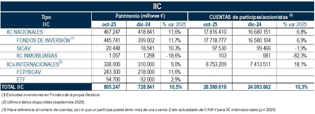 El patrimonio en conjunto de la inversión colectiva (Fondos y Sociedades) experimentó un incremento hasta octubre de 76.405 millones de euros, situándose en 805.247 millones de euros (10,5% más que en diciembre de 2024).