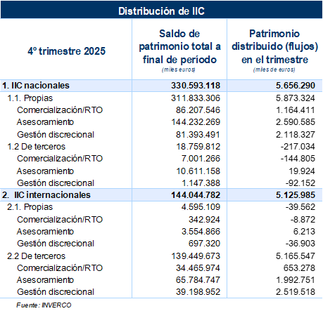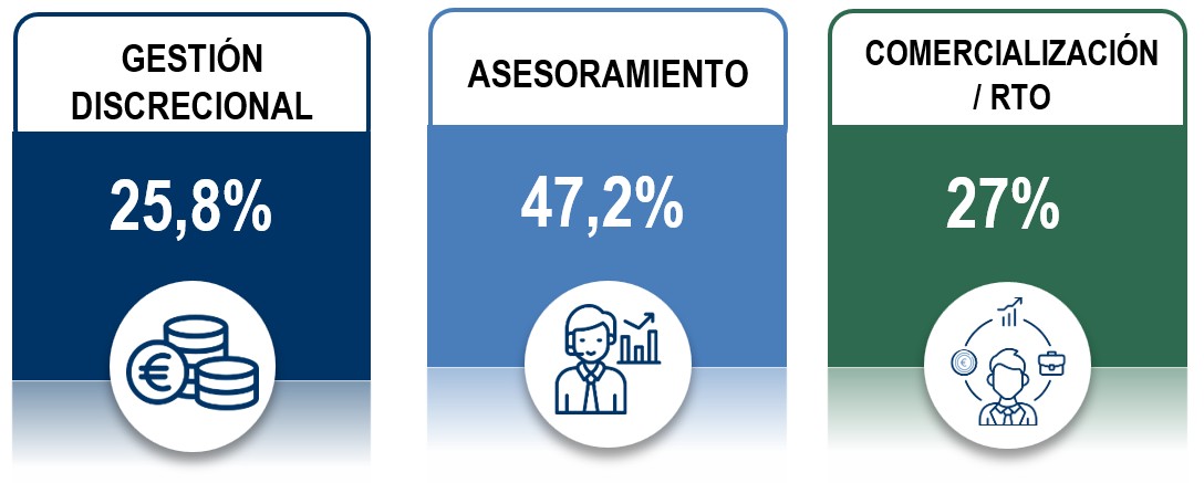 Con una muestra aproximada del 75% de la distribución de IIC en España, el 73% se distribuye mediante gestión discrecional o asesoramiento (346.620 millones de euros) y el 27% vía comercialización, con datos a diciembre de 2025.