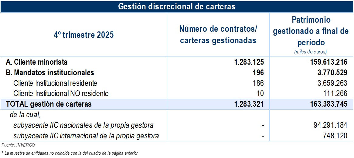 De acuerdo con los datos recibidos por las Gestoras de IIC, que han facilitado información sobre esta actividad desarrollada por sus grupos financieros, la cifra estimada de patrimonio en Gestión Discrecional de Carteras se situaría en torno a 166.000 millones de euros a finales de diciembre de 2025 (163.384 millones para las Gestoras que facilitan dato).