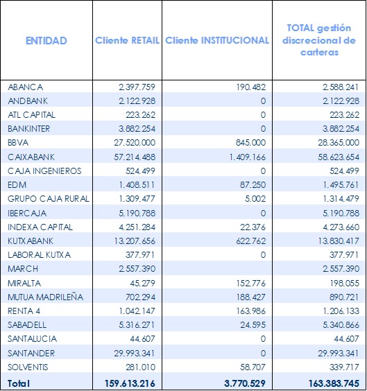 ➡️El detalle por entidad de la actividad de gestión discrecional de carteras desarrollada por sus grupos financieros, para las entidades que facilitan información, es la siguiente: