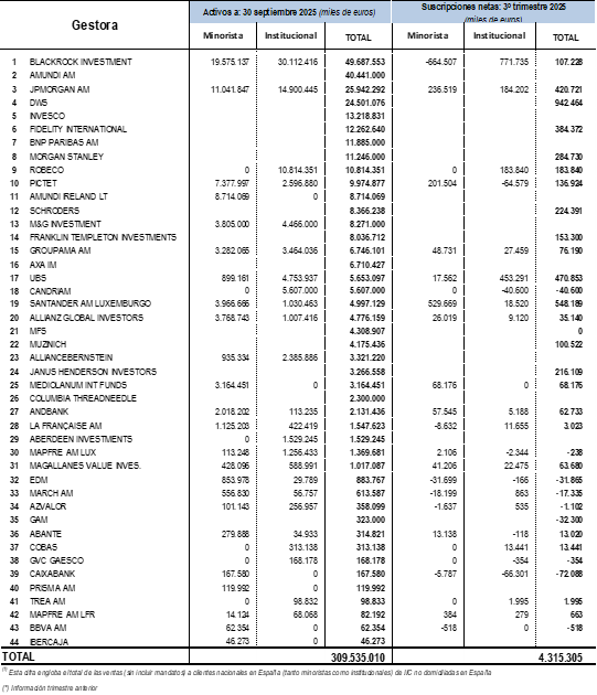 SUSCRIPCIONES NETAS: En el tercer trimestre de 2025, las IIC internacionales comercializadas en España habrían registrado unas suscripciones netas de 5.000 millones, por lo que en el conjunto del año ascenderían a 18.000 millones de euros.