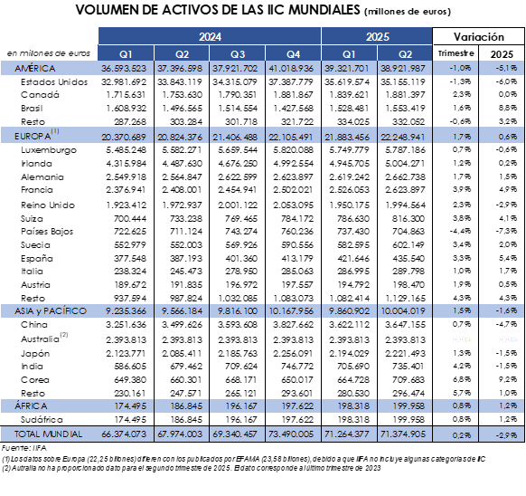 Los ACTIVOS de las Instituciones de Inversión Colectiva (IIC) a nivel mundial se situaron en 71,37 billones de euros en junio de 2025, lo que supuso un aumento del 0,2% respecto a marzo de 2025.