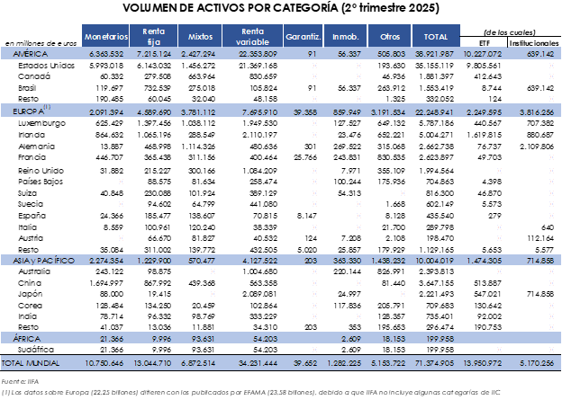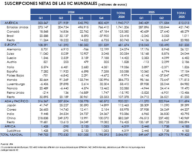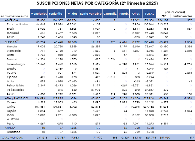 La mayor parte de los nuevos flujos de entrada se concentraron en el continente asiático alcanzando los 322.964 millones de euros destacando China (237.482 millones de euros). En el segundo trimestre de 2025 tanto el continente europeo como el americano registraron suscripciones de cierta magnitud (305.074 millones de euros en su conjunto) aglutinando casi la mitad de las captaciones mundiales. Por países EE.UU fue el que más suscripciones netas reflejó (133.844 millones de euros) seguido de Irlanda (73.647 millones de euros).