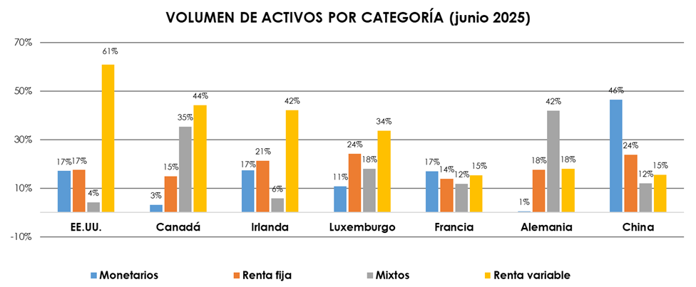 El patrimonio por categorías de IIC a nivel mundial en junio de 2025 se distribuyó de la siguiente forma: las de renta variable representaron el 48%, las de renta fija el 18,3%, los monetarios el 15,1%, las mixtas el 9,6%, las inmobiliarias el 1,8% y el resto el 7,2%.
