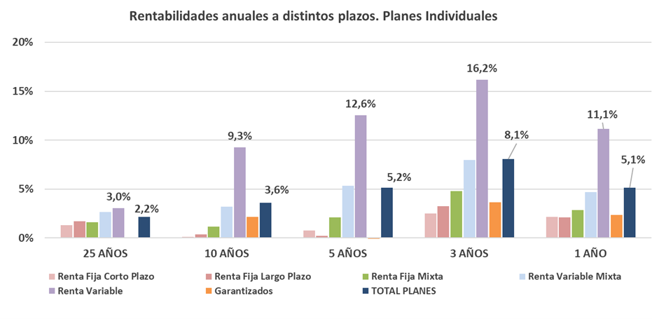 La rentabilidad interanual para el conjunto de Planes superó el 5%, destacando la categoría de Renta Variable con una revalorización del 11,1%, y los Renta Variable Mixta con el 4,7%. A más largo plazo (5 años) la categoría de Renta Variable aporta una rentabilidad media anual del 12,6%.